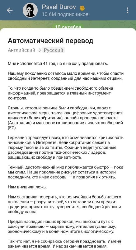 «Свободный интернет умирает. Время уходит, и оно уходит у нас». Сегодня Павел Валерьевич отмечает 41-й день рождения. Однако вместо празднования он опубликовал гнетущий пост, в котором выразил глубочайшую печаль по поводу текущей ситуации и перспектив ее ухудшения. Государства по всему миру ограничивают свободу в интернете ради своих интересов и контроля. Эти изменения происходят в Европе, Китае, США, Канаде, а также, конечно, в России. Желаем вам, Павел Валерьевич, успехов в развитии Telegram и в борьбе за сохранение свободного интернета. Постмейкер - автоматическое ведение канала 🤖 Анимация | СhatGPT-4 | Помощь с резюме