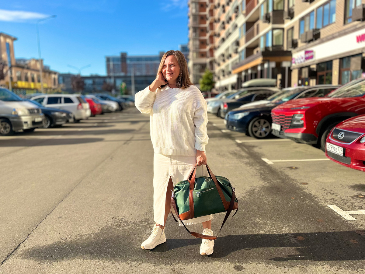 Моя модель – дорожная сумка Brig Green, цвета понравились именно такие, а вообще представлена она в разных вариантах от бежевого и небесно-голубого до черного. В данном случае в составе наполовину кожа, а вторая половина – мембрана, для дорожного варианта это идеально, за счет мягкого и податливого материала вещей вмещается больше. У меня, например, в длину сумки стоя вместился ноутбук, а в ширину – не самая маленькая и тонкая книга в плотном переплете. Ну а внутрь у нас поместились две пары запасных джинсов, футболки, два свитера, сменное белье и даже обувь запасная на всякий случай. Это не считая документов и уходовой косметики на каждый день. Честно, мне просто надоело возить в небольшие поездки чемодан М-ку, с сумкой гораздо удобнее, все необходимое в нее влезает, а места в итоге занимаешь меньше.