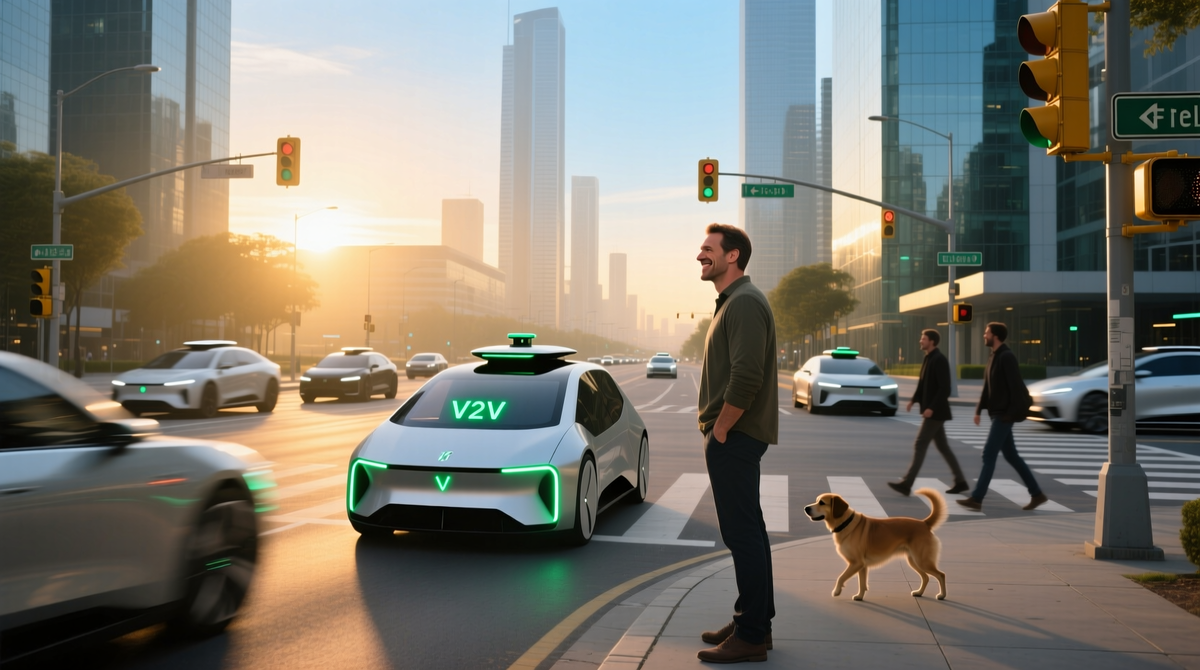 — Это V2V-связь называется. Машины между собой переговариваются. Видишь, на панели датчик моргает? Вот он данные передаёт — куда еду, с какой скоростью, когда поворачивать собираюсь. Другие машины то же самое делают. Система всё просчитывает и каждому траекторию выдаёт. Чтоб не столкнулись.