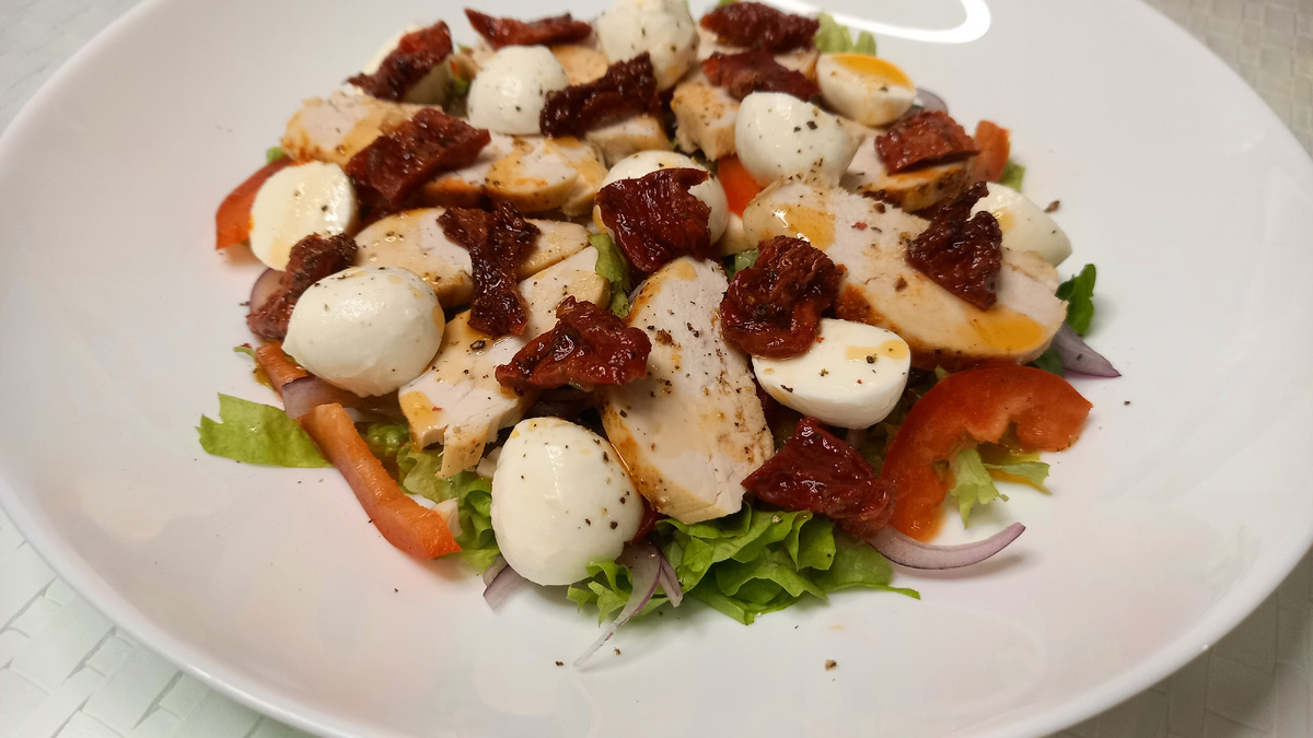 Запеченная грудка у меня уже была, перец и лук тоже, купила только моцареллу, она очень хорошо сочетается с вялеными томатами.