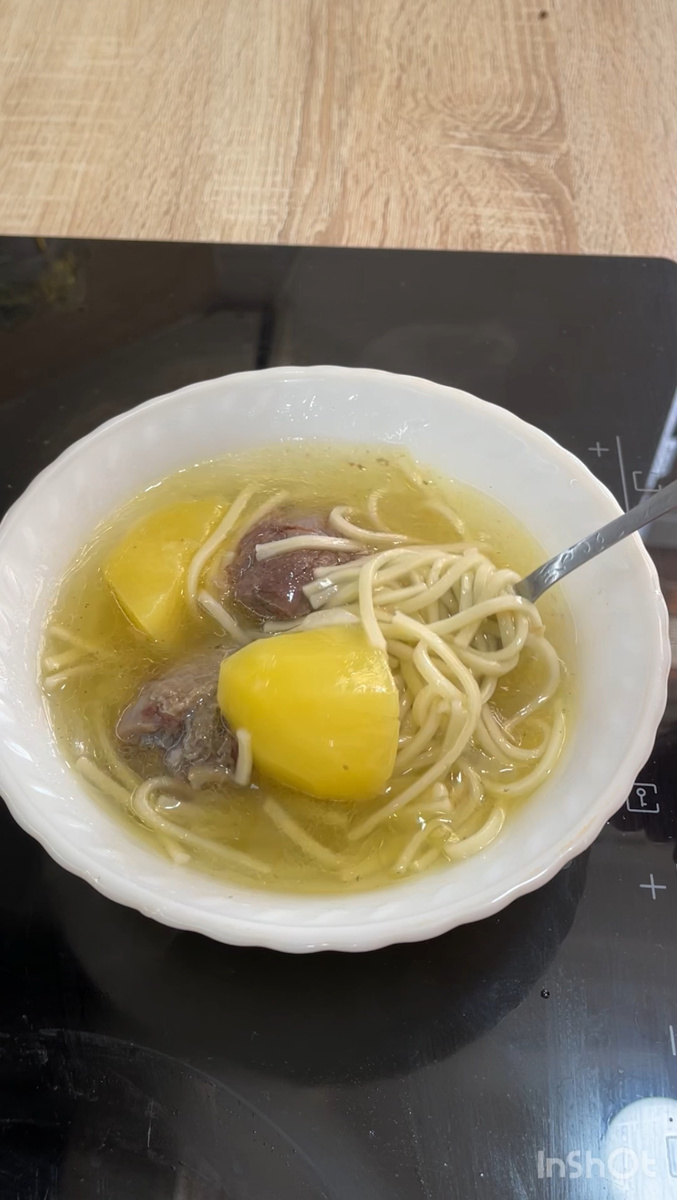 Сытный, ароматный суп с говядиной, картофелем и лапшой — идеальное блюдо для семейного обеда. Мясо получается мягким, бульон — прозрачным и насыщенным, а лапша придаёт лёгкость и уютный вкус детства. Ингредиенты: Говядина (на кости или мякоть) — 1 кг Вода — 3 л Лук репчатый — 1 шт. Картофель — 3–4 шт. (крупные) Лапша (готовая, домашняя или яичная) — по вкусу Соль — по вкусу Чёрный молотый перец — по вкусу Зелень Приготовление: 1. Бульон. В казан положите говядину, залейте 3 литрами воды. Когда закипит, аккуратно снимите пену, убавьте огонь до слабого и варите мясо около 2 часов, пока не станет мягким. 2. Добавляем лук. Лук мелко нарежьте и отправьте в бульон. Варите 15 минут. 3. Картофель. Нарежьте картошку крупными кубиками и добавьте в суп. Варите 10 минут, пока она не станет мягкой. 4. Мясо. Готовое мясо выньте, нарежьте крупными кусочками и верните в суп. 5. Лапша. Добавьте готовую лапшу (по желанию — домашнюю или покупную). Варите до готовности лапши, примерно