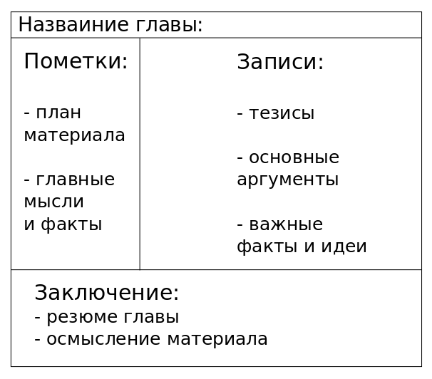 - Левое поле (узкая колонка): во время лекции оно пустует. А вот сразу после пары вы возвращаетесь к нему и записываете сюда ключевые вопросы, которые раскрывает каждый тезис из основного поля. Например, справа у вас «Причины Первой мировой войны», а слева - «К