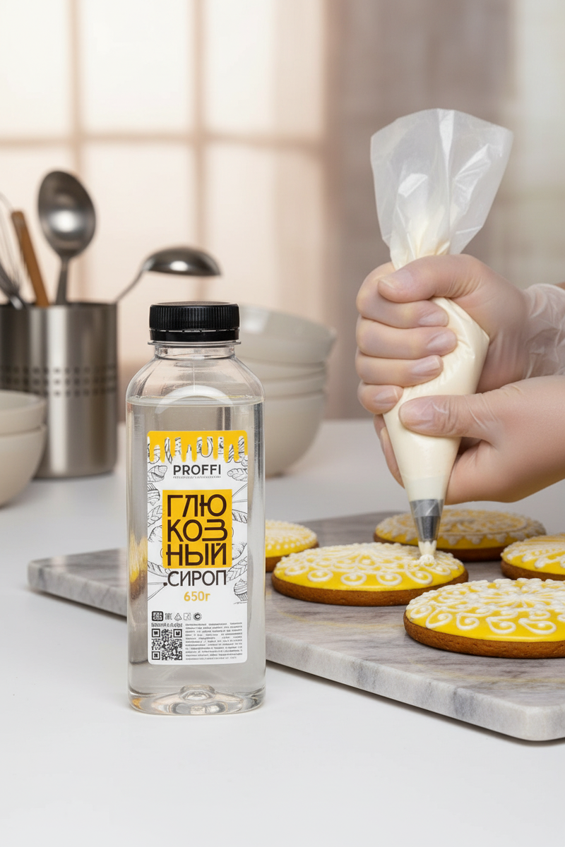 Гладкая, блестящая и устойчивая к трещинам. 1. Взбейте белок до лёгкой пены. 2. Постепенно добавляйте сахарную пудру — порциями, чтобы глазурь не стала комковатой. 3. Влейте глюкозный сироп и лимонный сок, перемешайте до гладкости. 4. Консистенцию регулируйте: если нужно гуще — добавьте пудру, если жиже — каплю воды. 💡Совет: глюкозный сироп делает глазурь эластичной и блестящей, а пряники не «потеют» при хранении. Можно окрашивать гелевыми красителями и использовать для контуров или заливки🎨 Глюкозный сироп 43% PROFFI (арт. WB 17915241 OZON 227560049)