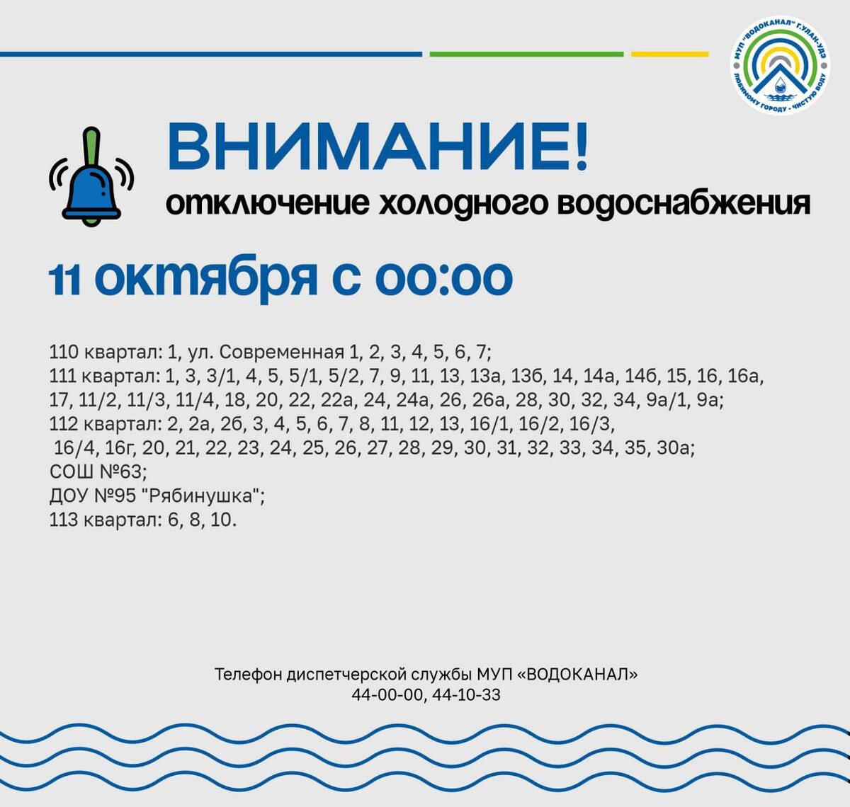 ‼️ Часть сотых останется без воды В связи с проведением аварийно-восстановительных работ на водопроводной сети диаметром 700 мм в 112 мкрн, с 11 октября с 00:00 часов будет прекращена подача холодного водоснабжения для следующих потребителей: Просим Вас запастись необходимым количеством воды. Будет организован подвоз воды, подробную информацию сообщим дополнительно. 📲 Подписывайся на нас в МАХ