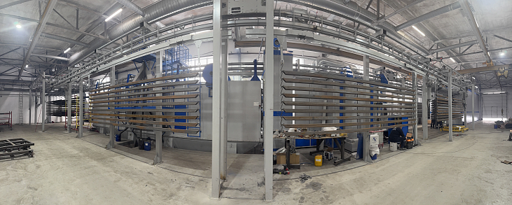 В компании «Алтай-Тент» запущена современная высокотехнологичная линия полимерной окраски металла, разработанная специально под собственные потребности производителя стальных тентовых конструкций. Новая установка направлена на повышение эффективности процессов, повышение производительности и улучшение качества продукции предприятия. Новая производственная линия состоит из трех ключевых блоков: 1. Дробеструйная обработка деталей Используется чугунная или стальная дробь для глубокой очистки поверхности металла. Обработка осуществляется одновременно восемью турбинами, что обеспечивает полное удаление оксидной пленки и загрязнений, а также высокий уровень адгезии. 2. Покрасочный узел Нанесение полимерного покрытия выполняется в два этапа: o Роботами наноcится порошковая краска; o Затем выполняется запекание полимерного покрытия для придания изделию долговечности и устойчивости к внешним воздействиям. 3. Тактовый конвейер Конвейер синхронизирует работу всех узлов линии, гарантируя точное