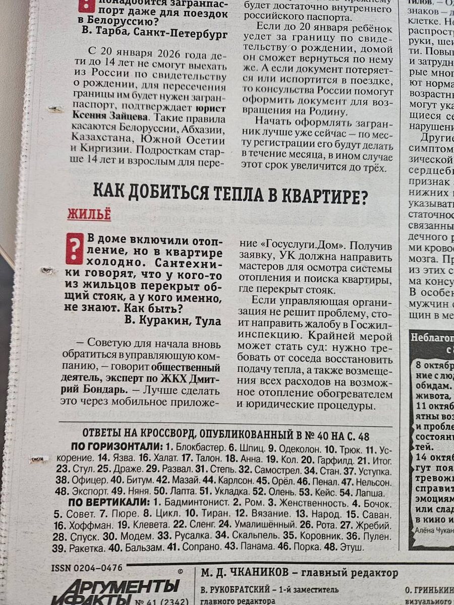 А у вас уже тепло? Если вы до сих пор мерзнете дома, для вас есть горячая информация — в прямом смысле! Вместо того чтобы кутаться в плед и пить горячий чай, пора действовать! В новом выпуске еженедельника «Аргументы и Факты» (№41) я отвечаю на ключевой вопрос начала отопительного сезона: «Как добиться тепла в квартире?»