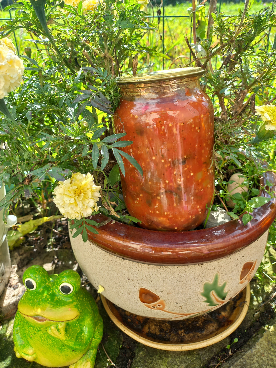 Всем привет! Я финиширую с заготовками на зиму. Сегодня размещаю рецепт острой закуски из баклажанов "Тещин Язык". Это вкусно, в меру остро и зимой очень актуально. Готовить не сложно. Способ приготовления: Подготавливаем овощи. Баклажаны моем, отрезаем "хвостики", нарезаем ломтиками . Помидоры моем, нарезаем ломтиками. Сладкий перец моем, убираем семена и перегородки, нарезаем широкой соломкой. Помидоры измельчаем, как вам удобно. Я в измельчителе порционно. Томатную массу помещаем в кастрюлю. Ставим кастрюлю на плиту, на сильный нагрев. Доводим до кипения. Уменьшаем нагрев и варим еще 10 минут. Добавляем в кастрюлю соль, сахар, растительное масло, специи. В готовую томатную смесь помещаем ломтики баклажанов. Варим 10 минут. Добавляем в кастрюлю перец. Варим еще 7 минут. За это время измельчаем чеснок и перец чили (без семян). чеснок можно натереть на мелкой терке. Добавляем перец чили и чеснок в кастрюлю к остальным овощам. Варим еще 5 минут, вливаем уксус. Убираем кастрюлю с