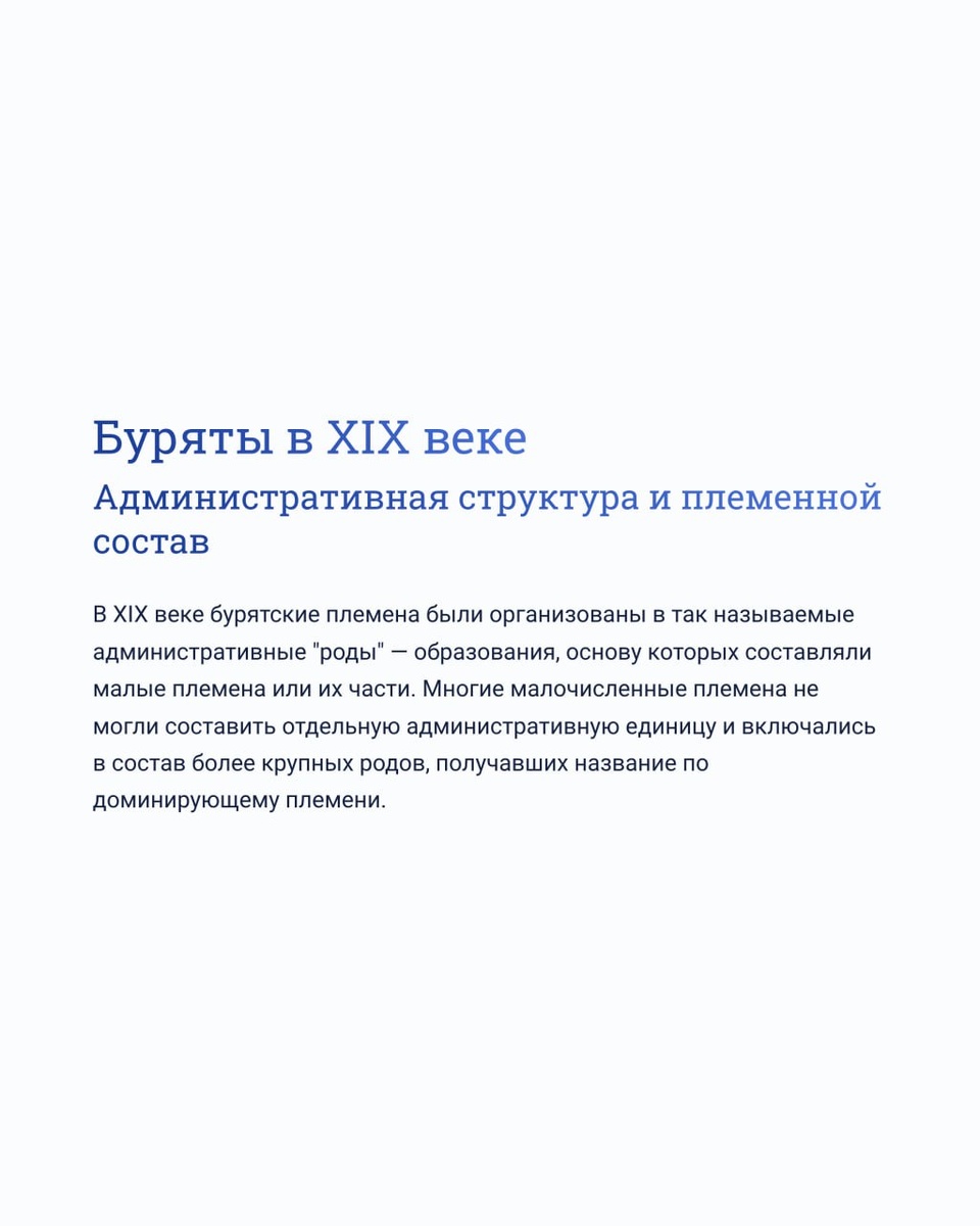 Буряты в XIX веке Административная структура и племенной состав В XIX веке бурятские племена были организованы в так называемые административные "роды" — образования, основу которых составляли малые племена или их части. Многие малочисленные племена не могли составить отдельную административную единицу и включались в состав более крупных родов, получавших название по доминирующему племени. Больше о бурятской культуре и истории — в нашем канале 👉 https://t.me/universe_buryat