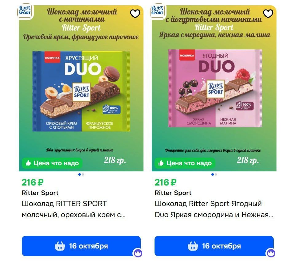 Шоколад RITTER SPORT молочный, ореховый крем с хлопьями и французское пирожное, 218 г за 216₽ https://ozon.ru/t/1GxeCAG Шоколад Ritter Sport Ягодный Duo Яркая смородина и Нежная малина, 218 г за 216₽ https://ozon.ru/t/dQcL49H ➕ забираем 100 бонусов у продавца в карточке товара под названием магазина, если не брали ранее (можно оплатить 25%)