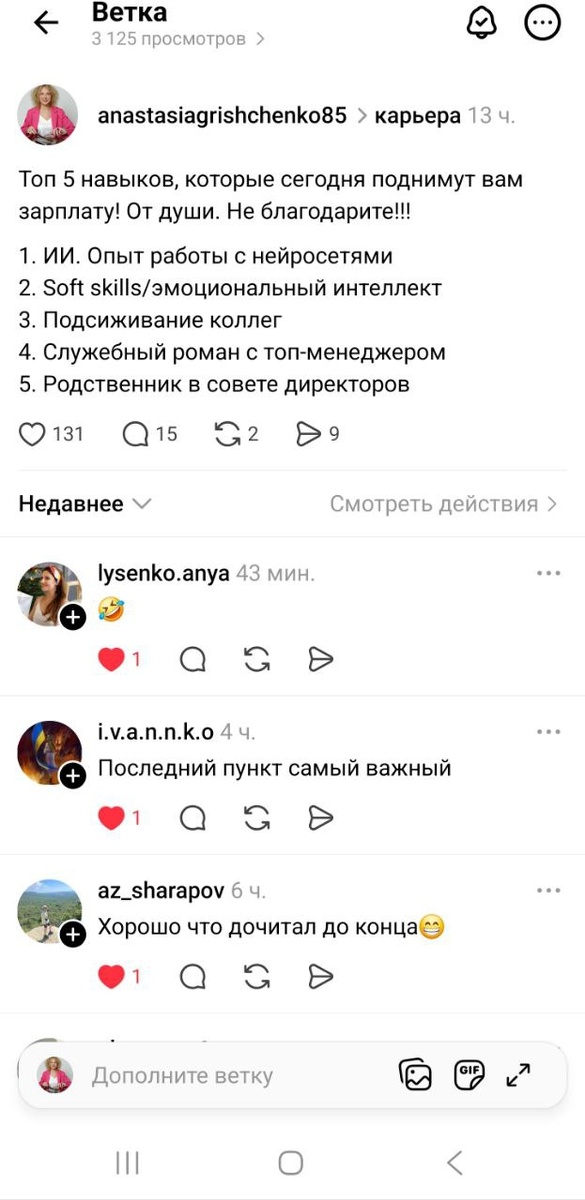 Совет как раскрутить Threads (и этот инструмент 🎻 тоже опробовали). Пишите всякую баянную фигню (мемы, тарелочницы, капучинщицы, обязательно, что мужики во всем виноваты и вот это вот все) и будет вам счастье))))