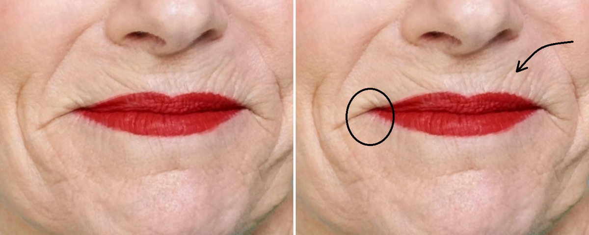 - да и сама помада уже спустя часа два скатывается в уголки губ (в морщины, идущие вниз).