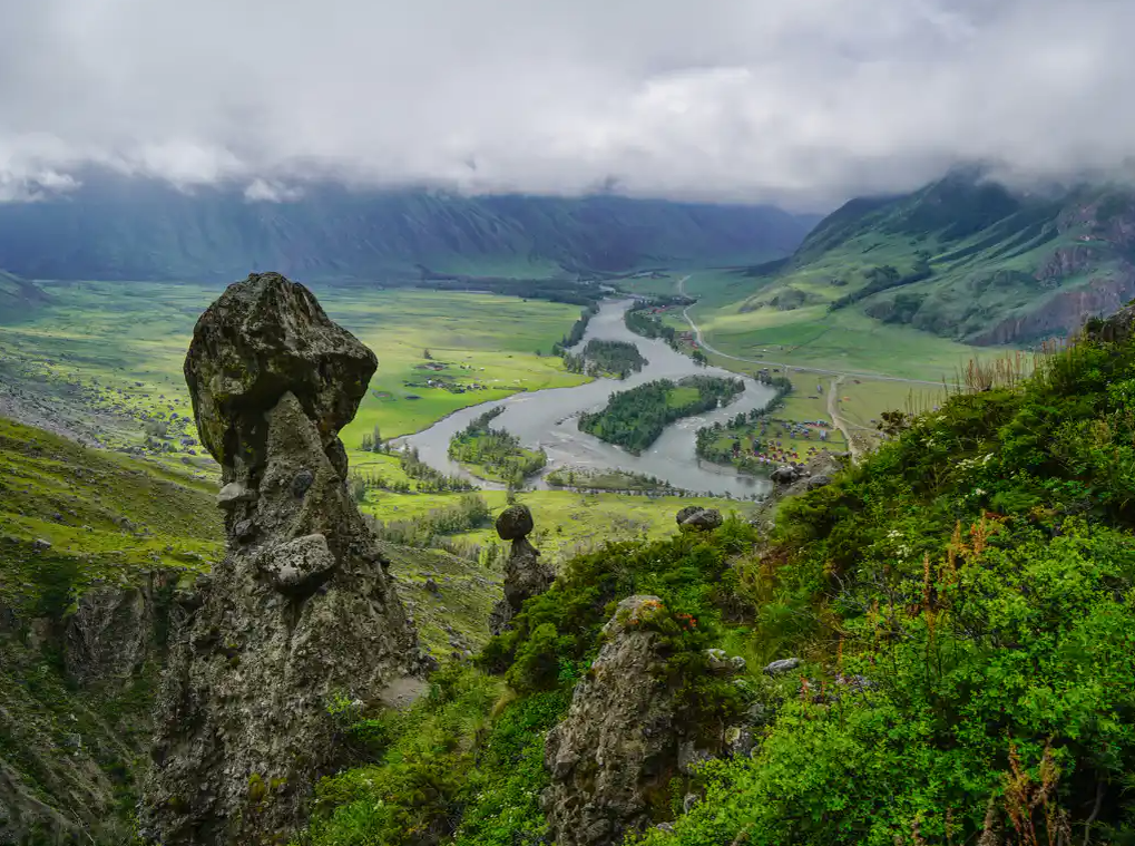 Маршрут и основные достопримечательности: Путешествие начинается в селе Артыбаш с прогулки на катере по Телецкому озеру до южного берега. По пути вы увидите водопады Корбу, Киште и Сорок Грехов. После прибытия на мыс Кырсай продолжение на вездеходах УАЗ по Чулышманской долине к уникальным Каменным грибам — природным скальным образованиям высотой от 2 до 7 метров.