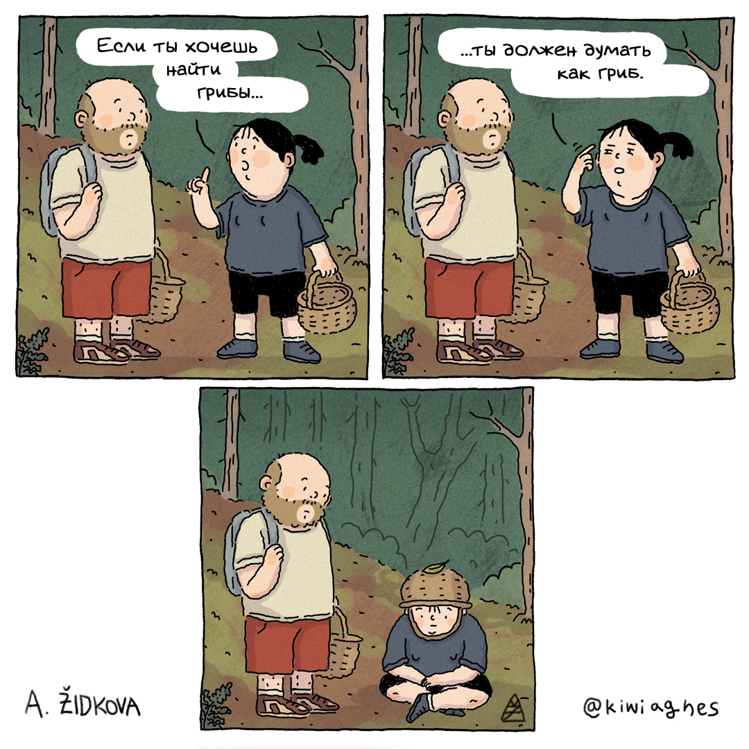 Благодаря интернету популярность многих вещей может легко распространяться по всему миру. К примеру, короткие юмористические комиксы сейчас рисует множество авторов из самых разных стран. Да и сюжеты художников из одного уголка планеты могут быть вполне понятны читателям из других мест. Героиня сегодняшней статьи любят отсылаться к популярным мемам, поэтому ее аудитория часто узнает в этих зарисовках отсылки к актуальным событиям. И читателям такое очень даже нравится! Надеюсь, что эти комиксы понравятся и вам. Анежка Жидкова (Anežka Židkova) - это чешская художница и аниматор, также известная под псевдонимом Kiwiagnes. Активно вести соцсети и делиться своими работами она начала в 2018 году - сейчас у художницы уже десятки тысяч подписчиков. В описании своего профиля Анежка Жидкова написала: «Рисую все, что мне подсказывает душа». Со своими читателями художница делится как иллюстрациями, так и комиксами, причем вторых обычно выходит гораздо больше. Помимо рисования комиксов для своих