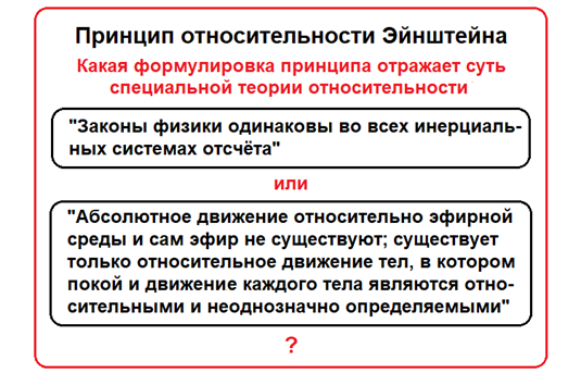 Вопрос, зачем это сделано? Ответ очевиден: из одинаковости законов физики во всех ИСО вывести несуществование эфирной среды Вселенной принципиально невозможно! Вопрос существования эфирной среды принципиальный в физике и разрешить его посредством абстрактных инерциальных систем отсчёта это просто несерьёзно. Поэтому вместо истинного принципа относительности Эйнштейна, утверждающего равноправность покоя и движения каждого из двух тел при их относительном движении, что соответствует равноправности движения поезда относительно вокзала и вокзала относительно поезда, в качестве принципа относительности было провозглашена одинаковость законов физики во всех ИСО, не имеющая к относительному движению никакого отношения.