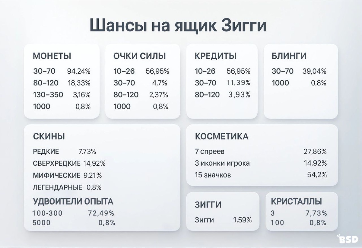 📦 Шансы ящик Зигги По информации от ParryParrot стали известны шансы на ящик Зигги: 📘 Скины 🧥 Редкие — 7,73%: Взрывной Волшебник Майк 🧥 Сверхредкие — 14,92%: Дикий Сту, Ужасная Биби 🧥 Эпические — 14,92%: Рокабилли Мортис, Стритрейсер Брок, Локи Честер, Трэшер Поко, Байрон Белый, Алый Р-Т 🧥 Мифические — 9,21%: Костяной Поко, Колдун Зигги, Ослепительный Зигги, Чёрный Маг Зигги 🧥 Легендарные — 0,8%: Призрачный Всадник Драко 🎁 Косметика 🫙 7 спреев (включая 4 на Зигги: spray_saw_robot 01–03) — 27,86% ❔ 3 иконки игрока (ящик Зигги, action, badrandoms, super1) — 14,92% 🎁 15 значков (в том числе monkey_blind, monkey_deaf, monkey_dumb, champie_lighter, fire) — 54,2% 💵 Монеты • 30–70 — 94,24% • 80–120 — 18,33% • 130–350 — 3,16% • 1000 — 0,8% 💎 Кристаллы • 3 — 7,73% • 100 — 0,8% 💪 Очки силы • 10–26 — 56,95% • 30–70 — 4,7% • 80–120 — 2,37% • 1000 — 0,8% 💀 Кредиты • 10–26 — 56,95% • 30–70 — 11,39% • 80–120 — 3,93% 🪙 Блинги • 30–70 — 39,04% • 1000 — 0,8% 🎟 Удвоители опыта • 100