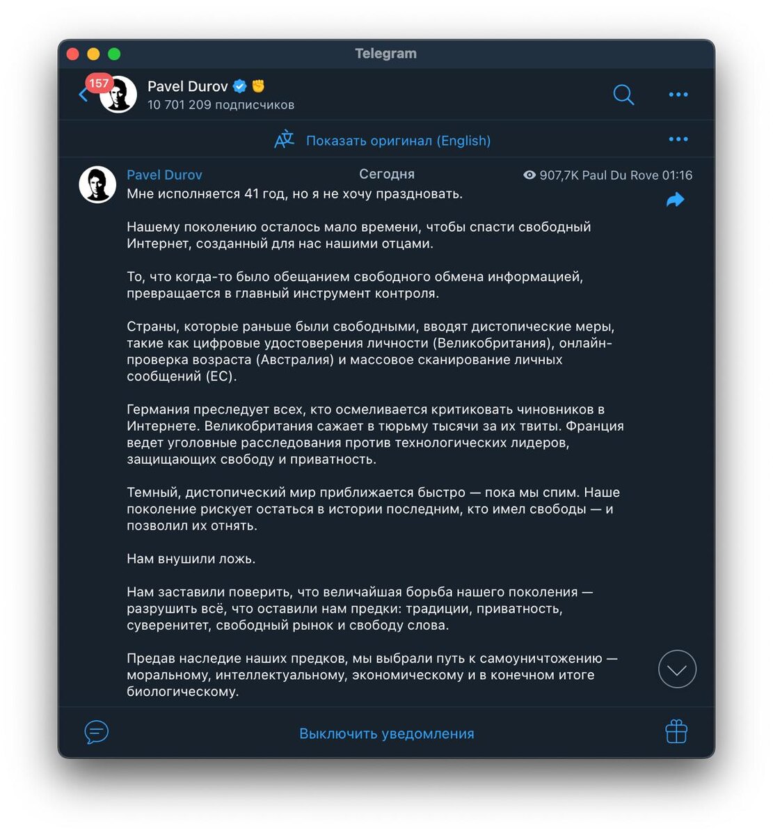 Павлу Дурову исполнился 41 год. Но отмечать он не будет, потому что у нас мало времени на спасение свободного интернета. Темный, дистопический мир приближается быстро — пока мы спим. Наше поколение рискует остаться в истории последним, кто имел свободы — и позволил их отнять Жутковатое начало пятницы 😐