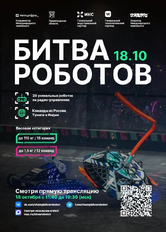 🤖Третий этап «Битвы роботов» 📍Площадкой для третьего этапа «Битвы роботов» станет Всесезонный курорт «Игора» по адресу: Ленинградская область, Приозерский муниципальный район, с.п. Сосновское, п. Платформа 69-й км, ул. Всесезонная, д. 1, корп. 88. 🗓Состязание пройдет 18 октября. 🔹На арене встретятся 28 команд инженеров России, Туниса и Индии. В программе — поединки мощных машин в категориях до 110 кг и до 1,5 кг. Состав участников: ➖16 команд (взрослые) — роботы до 110 кг; ➖12 команд (дети) — мини-роботы до 1,5 кг. 🔹Не упустите возможность стать свидетелем технологического шоу и увидеть, как соревнуются роботы! ➡️Подробнее о «Битве роботов» на сайте https://www.gosuslugi.ru/landing/bitvarobotov ➡️Ссылка на прямую трансляцию Чемпионата https://vkvideo.ru/video-219465931_456240922