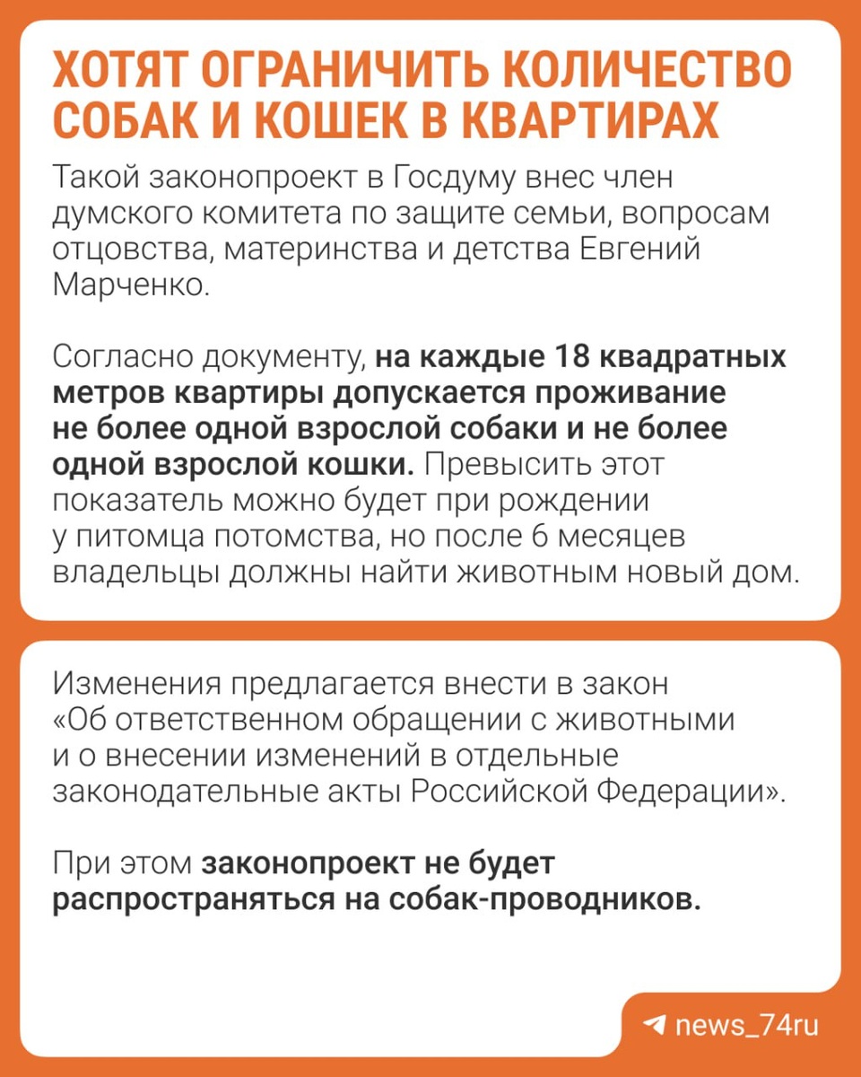 В России хотят ограничить количество собак и кошек в квартирах Зачем это нужно и что именно предлагают депутаты, читайте в карточках @74.ru ⬆️ Поддерживаете такую идею? 👍 — да, давно пора 😢 — пушистых много не бывает