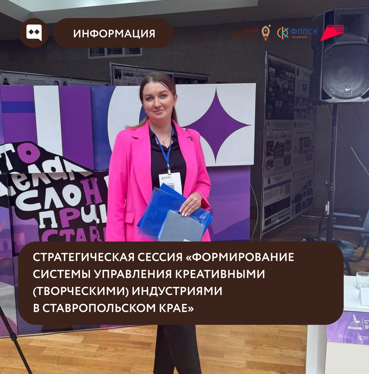 Сегодня в Городском Дворце культуры г. Железноводска состоялась Стратегическая сессия «Формирование системы управления креативными (творческими) индустриями в Ставропольском крае», которую посетила заместитель директора центра «Мой бизнес» Ставропольского края Коваленко Анастасия. Целью данного мероприятия является обсуждение вопросов направленных на поддержку творческих профессий, медиа, дизайна и цифрового контента. Ключевыми механизмами поддержки являются образовательные, финансовые, имущественные и информационные меры, а также разработка стандартов и стратегий развития. Центр «Мой бизнес» продолжит работу по оказанию мер поддержки для становления и развития предпринимательства в Ставропольском крае.