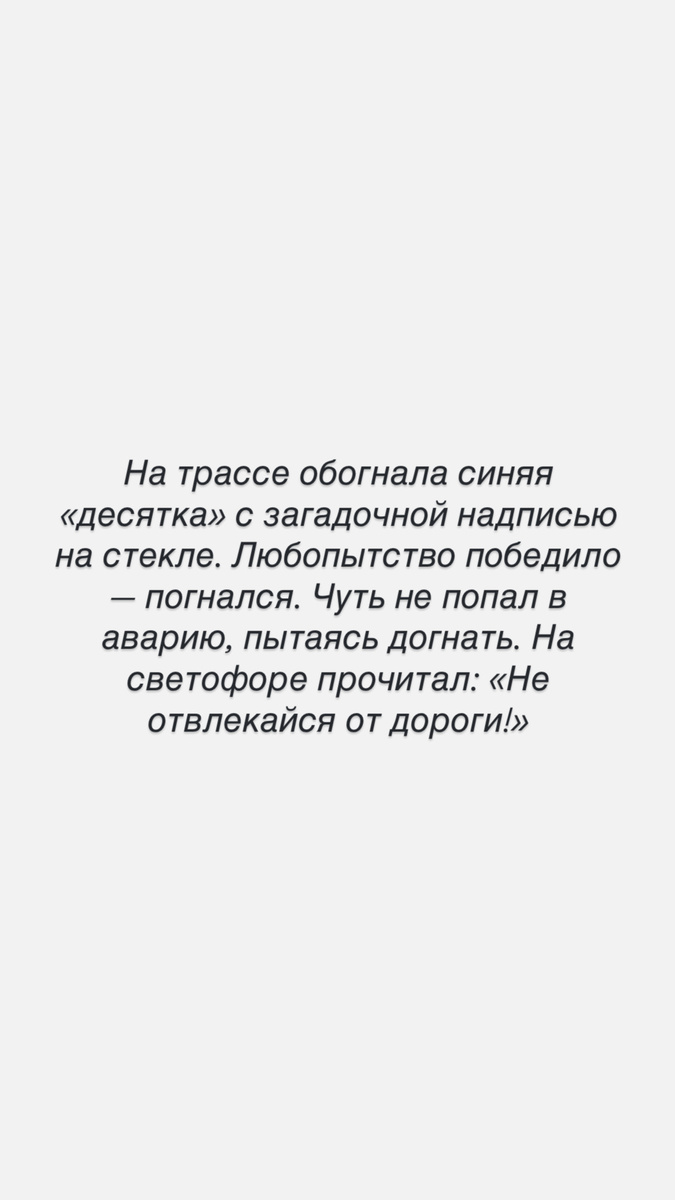 На трассе обогнала синяя «десятка» с загадочной надписью на стекле. Любопытство победило — погнался. Чуть не попал в аварию, пытаясь догнать. На светофоре прочитал: «Не отвлекайся от дороги!»