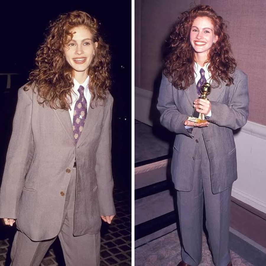 Молоденькая Джулия Робертс, еще до славы «Красотки», приходит за своей наградой не в пышном платье, а в мужском костюме оверсайз от Армани. Девчонки, это были 90-е! Пойти на такое — это была настоящая смелость.