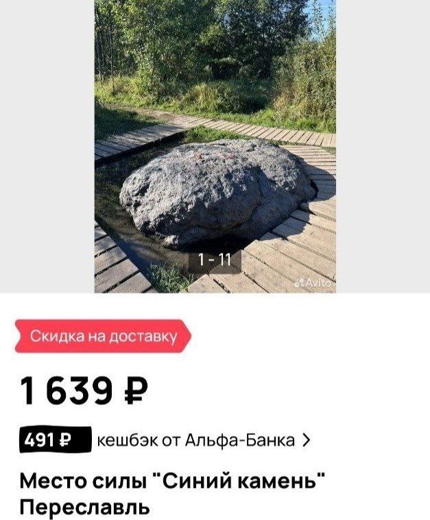 Новый вид бизнеса открыли жители Переславля Залесского. На Авито стала пользоваться бешеным спросом услуга по подзарядке энергией личных вещей от синего камня. За 3 тысячи рублей Алёна из Переславля получит по почте ваш талисман, часы, кулон и дойдёт до синего камня, где зарядит предмет энергией силы и природы. Если кому то покажется это дорого, то в прайсе у переславны есть другая услуга. Всего лишь за 1500 рублей Алёна найдёт маленький камушек на берегу озера который естественно заряжен энергией силы и отправит вам по почте.