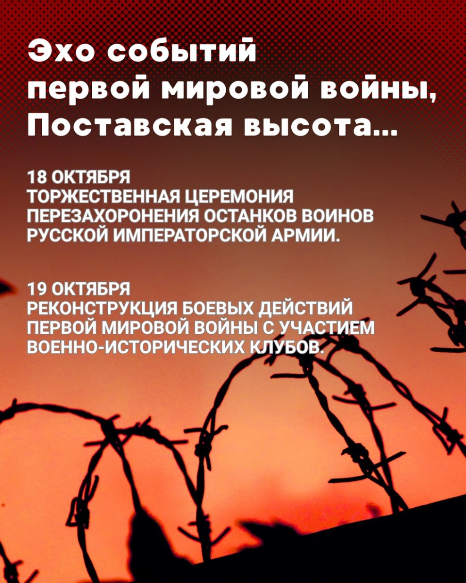 ⌛️ Эхо событий первой мировой войны, Поставская высота... 🔳 18 октября 2025 года в 15.00 состоится торжественная церемония перезахоронения останков воинов русской императорской армии. 📍Место проведения: городское кладбище № 1 возле деревни Макаровцы, воинский мемориал 🔳19 октября 2025 года в 14.00 состоится реконструкция боевых действий первой мировой войны с участием военно- исторических клубов. 📍Место проведения: участок линии укреплений пмв между а. Дуки и г. Поставы (со стороны водозабора «Спорица») #поставыбудьсчастливздесь #историко-культурныйтуризм #перваямироваявойна #военнаяреконструкция #поставскаявысота