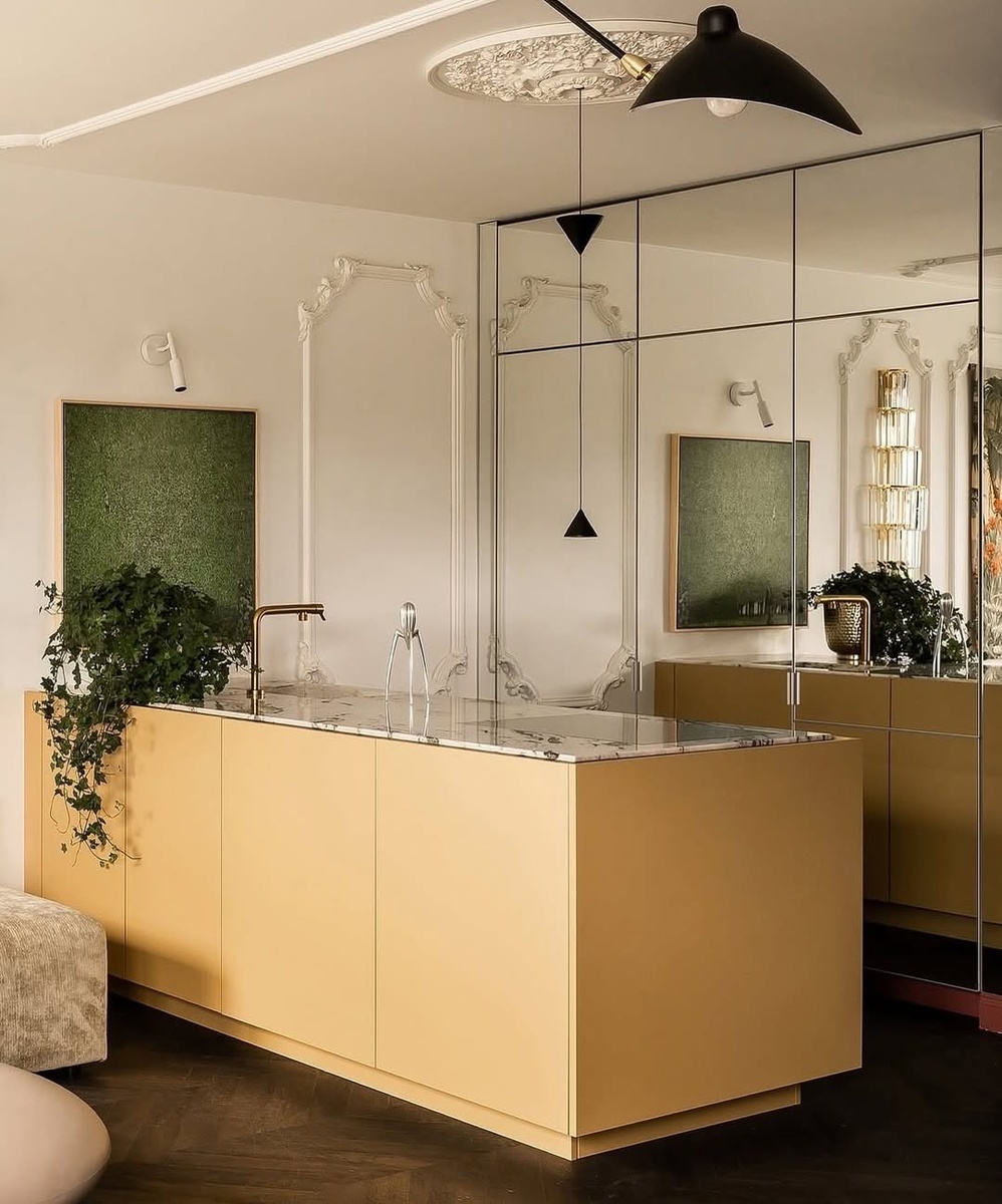 - В стандартной квартире при желании можно повторить приёмы: зеркальные панели (хотя бы фрагментарно), охристый остров или пенал, каменная столешница с выразительным рисунком, одно большое произведение искусства вместо россыпи мелкого декора.