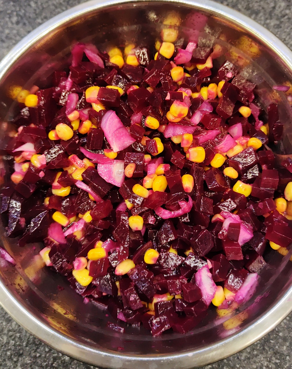 Свеклу отвариваем или покупаем варёную ,чистим, режим кубиком . Кукурузу высылаем к свекле , добавляем резанный кубиком лук. Заправляем заправкой, перемешиваем и кушаем .
