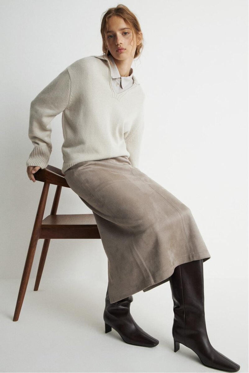 Идея утепленного сочетания для офисных будней от стилистов LIMÉ: фактурная юбка миди и свитер с ангорской шерстью, надетый поверх рубашки