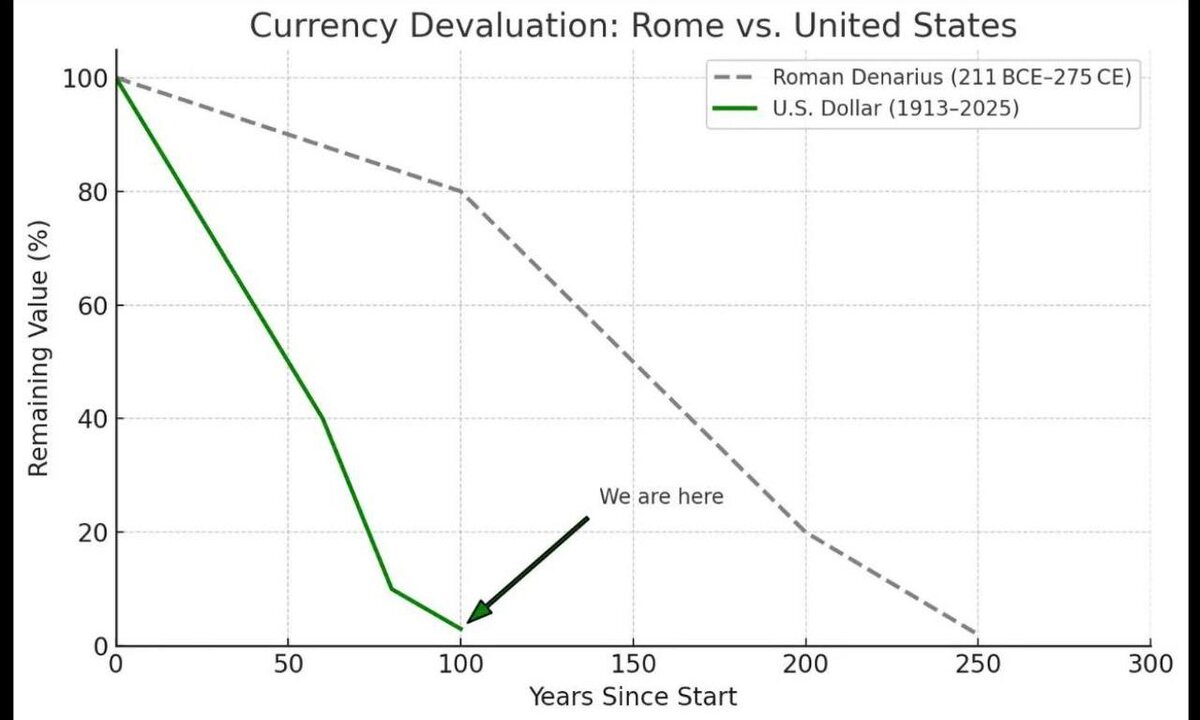 Денарий 2.0: Империя снова печатает Римская империя уничтожала ценность своей валюты два с половиной века. Америка справилась за один. На графике — деградация денег. Серебряный денарий терял вес постепенно: сначала добавляли примеси, потом вовсе убрали серебро. Доллар пошёл тем же путём — только быстрее. За 100 лет с момента создания ФРС он потерял более 95% покупательной способности. Империи не рушатся внезапно. Они просто начинают экономить на металле, потом на истине, а потом — на здравом смысле. Когда в системе слишком много долгов, остаётся только одно: обесценить всё. Это не случайность, это политика. К чему это приведёт? Каждый цикл обесценивания заканчивается бегством в реальные активы: землю, энергию, золото… и теперь — в цифровой эквивалент ценности, где никто не может «разбавить» эмиссию. Хотите, разберём подробнее, почему падение доллара — не катастрофа, а закономерный этап смены системы, и как в таких переходах выживают те, кто держит активы вне фиата? Поставьте реак