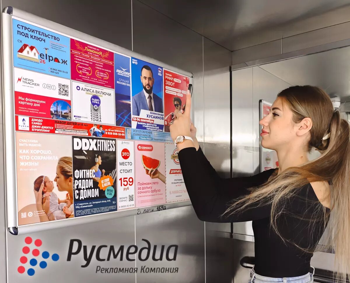 По данным исследований «Русмедиа» (мониторинг статистики заказчиков), 1 месяц рекламы в лифте сравним с месяцем рекламной кампании в электронных СМИ. Вот только цена размещения в последнем варианте запредельная, а рекламу в лифте могут позволить себе даже маленькие и только недавно открывшиеся предприятия с небольшим бюджетом.