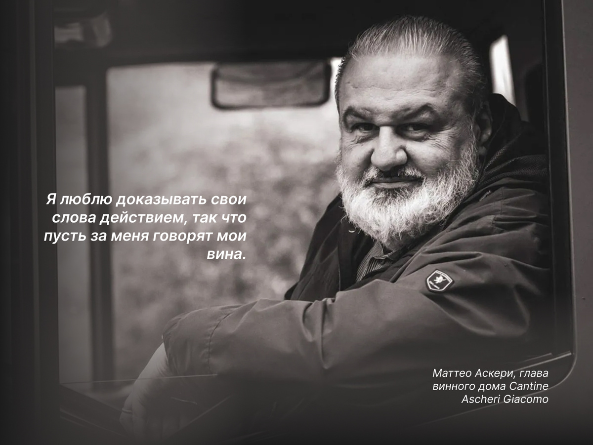 В тени виноградных лоз Пьемонта уже много лет идет незримая война между консерваторами и новаторами. Каждый винодел, выращивающий на этих холмах неббиоло, однажды вынужден выбрать сторону. Но есть тот, кто избежал этого выбора, мастерски балансируя между традицией и современностью. Это Маттео Аскери — независимый винодел, чьи вина говорят за него. Маттео Аскери принадлежит к старинной винодельческой семье, упоминания о которой появились в XVII веке. В 1880 году его прадед Джакомо перенес винодельню в городок Бра, что позволяло отправлять вина по железной дороге в Турин и на Лигурийское побережье. Несмотря на экономические трудности XX века, компания Cantine Ascheri Giacomo сумела выжить, оставаясь единственной винодельней Бра. В 1998 году 25-летний Маттео внезапно стал главой дома Ascheri после смерти отца. Пришлось взять на себя обязанности винодела и менеджера одновременно. Этот опыт сформировал его как независимого, уверенного и одновременно внимательного к деталям мастера. Маттео с