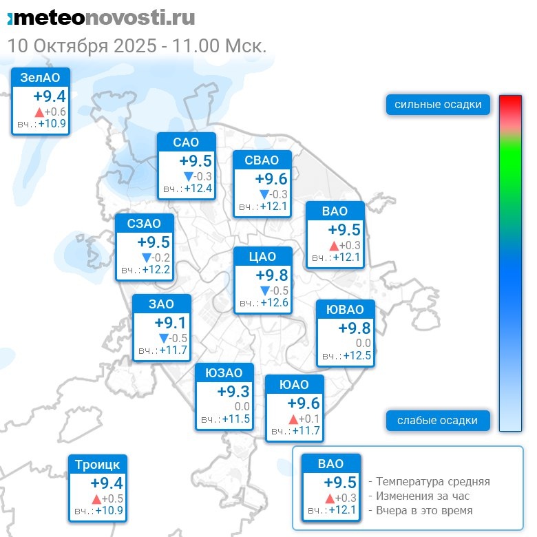 В 11:00 в Москве было от +8.7°C до +10.4°C, средняя температура +9.5°C #погода #Москва #осень #температура #10октября #пятница