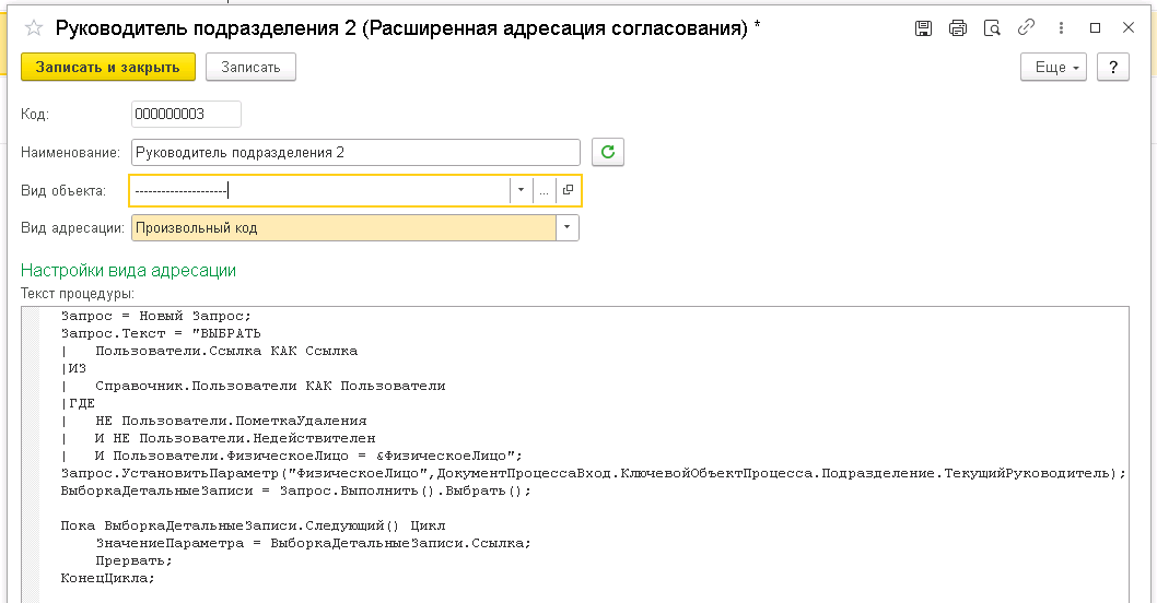Решали достаточно типовую задачу: нужно направить документ на согласование руководителю подразделения. Типовыми условиями расширенной адресации решить это не удалось, т.к. в подразделении в качестве руководителя указывается не пользователь, а физическое лицо. Есть возможность прямо в правилах расширенной адресации написать произвольный код, но нигде никаких комментариев про то, как это надо делать, я не нашел, так что пришлось копать самому. О чём дальше. Но где это написано? Первый вариант был такой: ЗначениеПараметра = Справочники.Пользователи.НайтиПоРеквизиту("ФизическоеЛицо", ДокументПроцессаВход.КлючевойОбъектПроцесса.Подразделение.ТекущийРуководитель); Но у него минус в том, что этот алгоритм может выдать неактивного или помеченного на удаление пользователя. Если вас это не смущает, то можете оставлять так, но я пошёл дальше. Итоговый текст кода: Запрос = Новый Запрос; Запрос.Текст = "ВЫБРАТЬ | Пользователи.Ссылка КАК Ссылка |ИЗ | Справочник.Пользователи КАК Пользователи |ГДЕ | Н