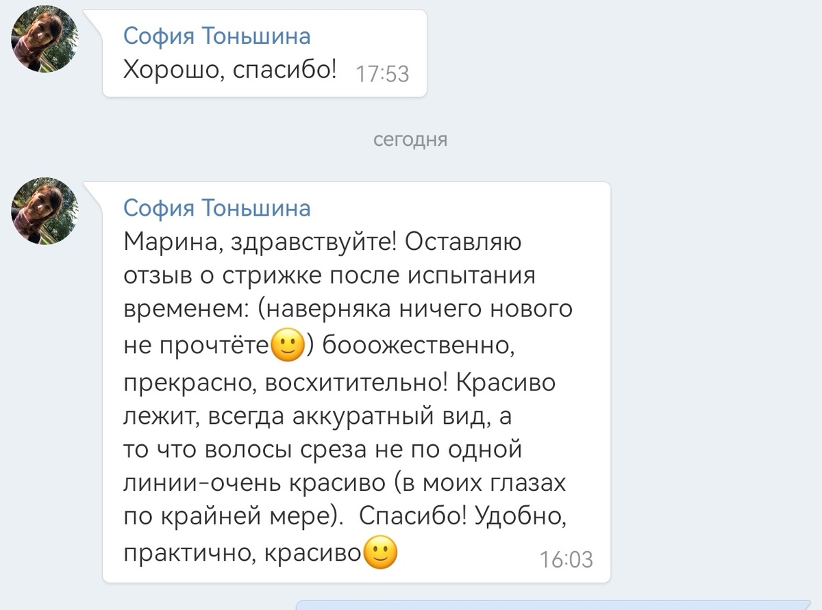 Я всегда искренне прошу своих клиентов поделиться впечатлениями спустя неделю или две после визита. И вот почему это так важно: ✨ За это время стрижка полностью «укладывается» ✨Вы привыкаете к подобранным средствам и осваиваете простоту ухода, которую подобралп именно для ваших волос и новой формы. ✨И самое главное — вы привыкаете к себе обновленной! Именно такая, «отсроченная» обратная связь — самая честная и ценная. Она подтверждает, что мы создали не просто красивую картинку на один день, а удобную, живую и стильную систему, которая радует вас каждый день. Вот один из таких отзывов, который я беру из моего сообщества ВКонтакте. долговечнаястрижка#стрижканадолго #советспециалиста #подборпрически #авторскиеметодики #парикмахерскаяуслуга #модныестрижки