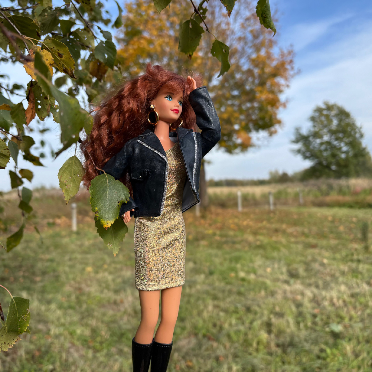 Всем привет) Осень еще держится в наших краях, пока холода не ниже десяти градусов мне все нравится. Пока еще наезжаем на дачу, захватила с собой двух кукольных друзей. Первая - моя постоянная уже спутница по осени рыжая Мидж. Кукла одна из немногих, кто уцелел в мега-распродаже барби из девяностых. Единственная Мидж, да и моих Терез она тоже «пережила». Эта кукла так же «победила» Мидж-русалочку😳 ту я смогла отпустить. Короче, любовь! Мидж из серии Эррин Магик, Волшебные сережки по-нашему. Привлекла она меня своими голубыми глазами и пышными рыжими волосами. Очень плохо, что долго кукла стояла с забранной под ленту с цветами челкой… в итоге чёлка сейчас напоминает рога)) Но мы решили, что для рокерского наряда такая прическа тоже уместна, полная свобода самовыражения и ветер в волосах! Правда хороший вопрос, что же Мидж забыла в таком наряде в деревне? А если даже она тут живет и пришла под утро из города с концерта или дискотеки? Вполне себе теория) В моем детстве были такие