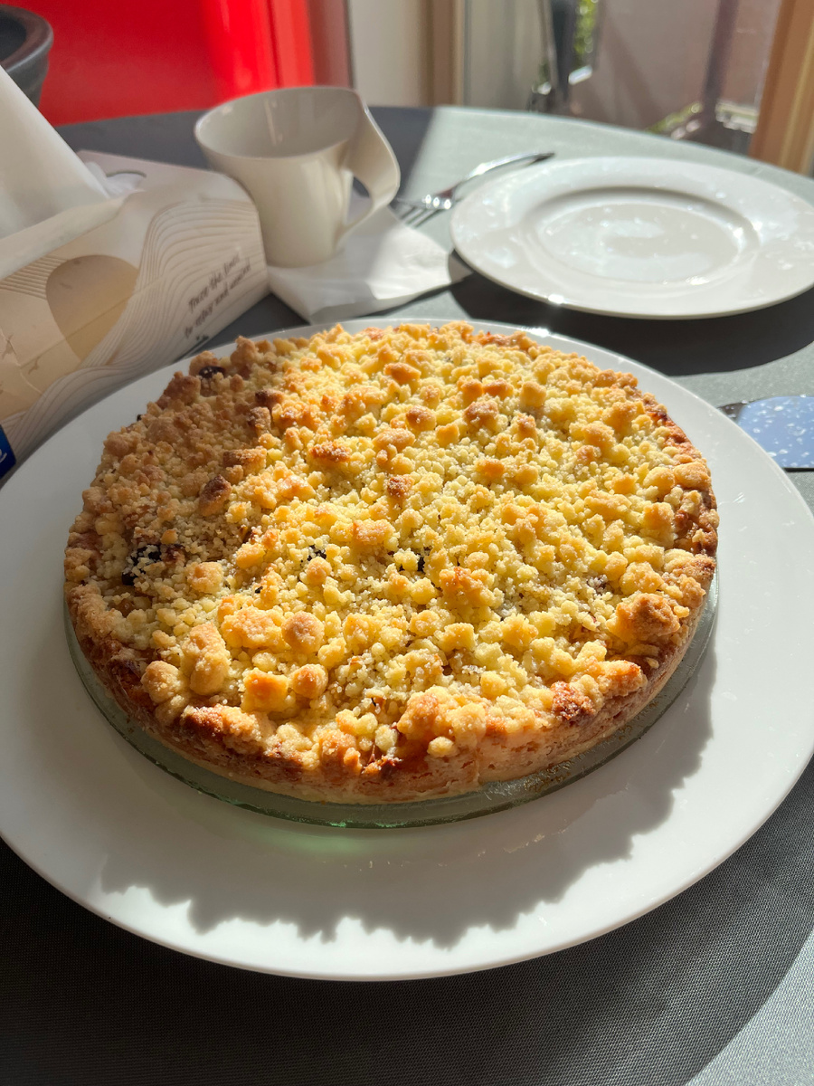 Тесто: масло-100 гр. сахар- 30 гр. яйца-2 шт. мука-2 ст. Всё смешать, скатать в шар и убрать в холод на 30 мин Начинка: яблока- 4 шт. масло-20 г. сахар-3 ст.л. корица-1 ч.л. орехи(любые)-100 гр. Яблоки мелко порезать, разогреть сливочное масло и немного протушить яблоки, добавить сахар, корицу и орехи. Штрейзель: масло(холодное)-100 гр. сахар-100 гр. мука-100-150 гр. Всё перемешать в мелкую крошку. Тесто тонко раскатать и выложить на дно формы Яблочную начинку выложить на тесто Посыпать штрейзелем Поставить в разогретую духовку, выпекать 35-45 мин