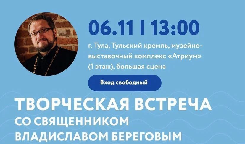 В четверг, 6 ноября, в 13:00 в Тульском кремле, в музейно-выставочном комплексе «Атриум» (1 этаж, большая сцена) состоится творческая встреча со священником Владиславом Береговым. Священник Владислав Береговой — настоятель Свято-Никольского храма в Мосальске и руководитель отдела по культуре и взаимодействию со СМИ Песоченской епархии. Он является интернет-миссионером, а его канал «Православие в телеге» стал победителем IX Международного фестиваля «Вера и слово» в номинации «Лучший просветительский Telegram-канал». На встрече у вас будет возможность приобрести книги и получить автограф священника. Вход свободный!