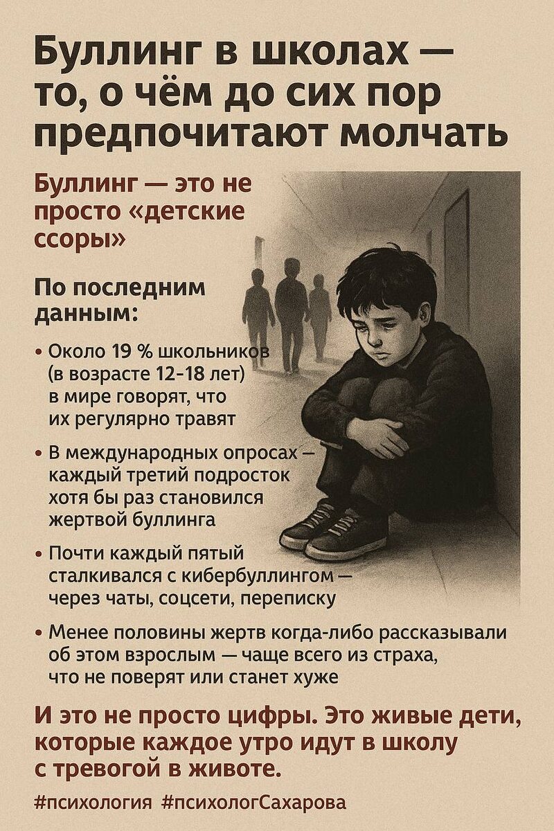 🎒 Буллинг в школах — то, о чём до сих пор предпочитают молчать Буллинг — это не просто «детские ссоры». Это системное насилие, которое разрушает психику, ломает самооценку и оставляет след на годы. 📊 По последним данным: Около 19 % школьников (в возрасте 12–18 лет) в мире говорят, что их регулярно травят. В международных опросах — каждый третий подросток хотя бы раз становился жертвой буллинга. Почти каждый пятый сталкивался с кибербуллингом — через чаты, соцсети, переписку. Менее половины жертв когда-либо рассказывали об этом взрослым — чаще всего из страха, что не поверят или станет хуже. И это не просто цифры. Это живые дети, которые каждое утро идут в школу с тревогой в животе. Кто-то из них потом годами лечит тревожные расстройства, депрессию, избегание. Кто-то замыкается навсегда. А кто-то — больше не приходит в школу вовсе. ❗ Буллинг — это не норма. Это форма насилия, которая требует внимания взрослых: родителей, педагогов, психологов. Важно, чтобы ребёнок знал: его слышат, ег