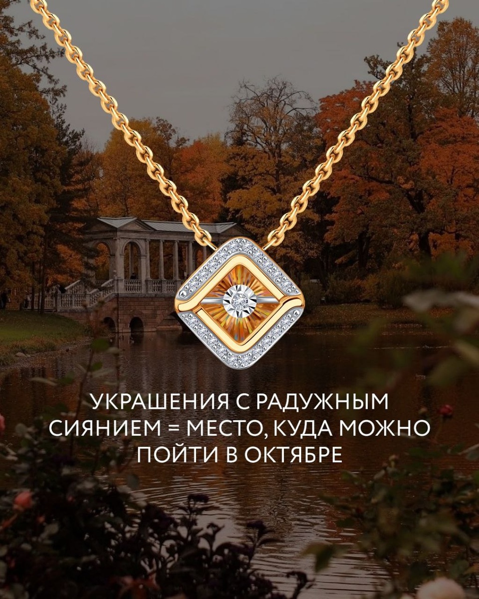Осень вдохновляет быть ярче ✨ Октябрь — месяц для новых впечатлений и ярких эмоций. Подготовили подборку мест, куда стоит отправиться, чтобы наполнить дни теплом, стилем и создать важные моменты. 🍁 Прогулка по золотому парку Пусть каждый шаг под шёпот опадающих листьев озарится радужным светом ваших украшений. 🍁 Встреча с подругой в уютном ресторане Стиль и душевное тепло в деталях — серьги и колье дополнят любой образ. 🍁 Спектакль — искусство и блеск В тени театральных кресел пробуждается сияние — бриллианты и радужное мерцание создают атмосферу настоящего волшебства. Осень — идеальное время создавать свои яркие истории.