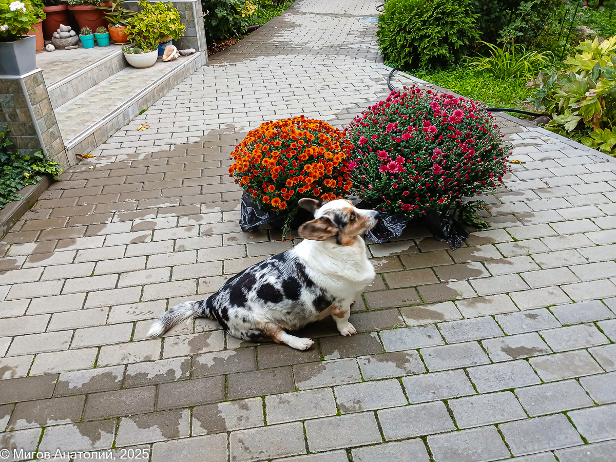 Горшки с геранью с крыльца убрал. Кактусы и алоэ занес в дом, для них так и так уже холодно на улице. А на освободившееся место поставил хризантемы. Тильда сразу на охрану заступила. Всё же вещь красивая, хрупкая и дорогая, вдруг кошки набезобразничают...
