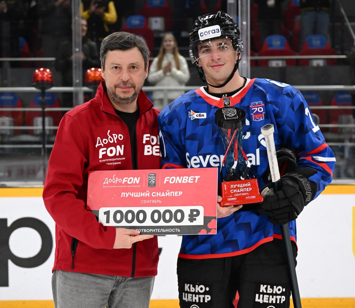 Лучшим снайпером сентября в Fonbet Чемпионате КХЛ стал Руслан Абросимов 🟡 из череповецкой «Северстали», на счету которого 7 заброшенных шайб в 9 матчах. От благотворительной программы ДоброFON ему был вручён специальный приз и чек на 1 000 000 рублей на благотворительные цели. В первом игровом месяце в Fonbet Чемпионате КХЛ сезона 2025/2026 году команды забросили 580 шайб, и по условиям благотворительной акции «Голевая передача» Fonbet перечислит 580 000 рублей Федерации адаптивного хоккея на организацию детского турнира по специальному хоккею и роликовому следж-хоккею, который состоится в Московской области в декабре. В командах по специальному хоккею тренируются дети с синдромом Дауна, расстройствами аутистического спектра и другими ментальными особенностями.