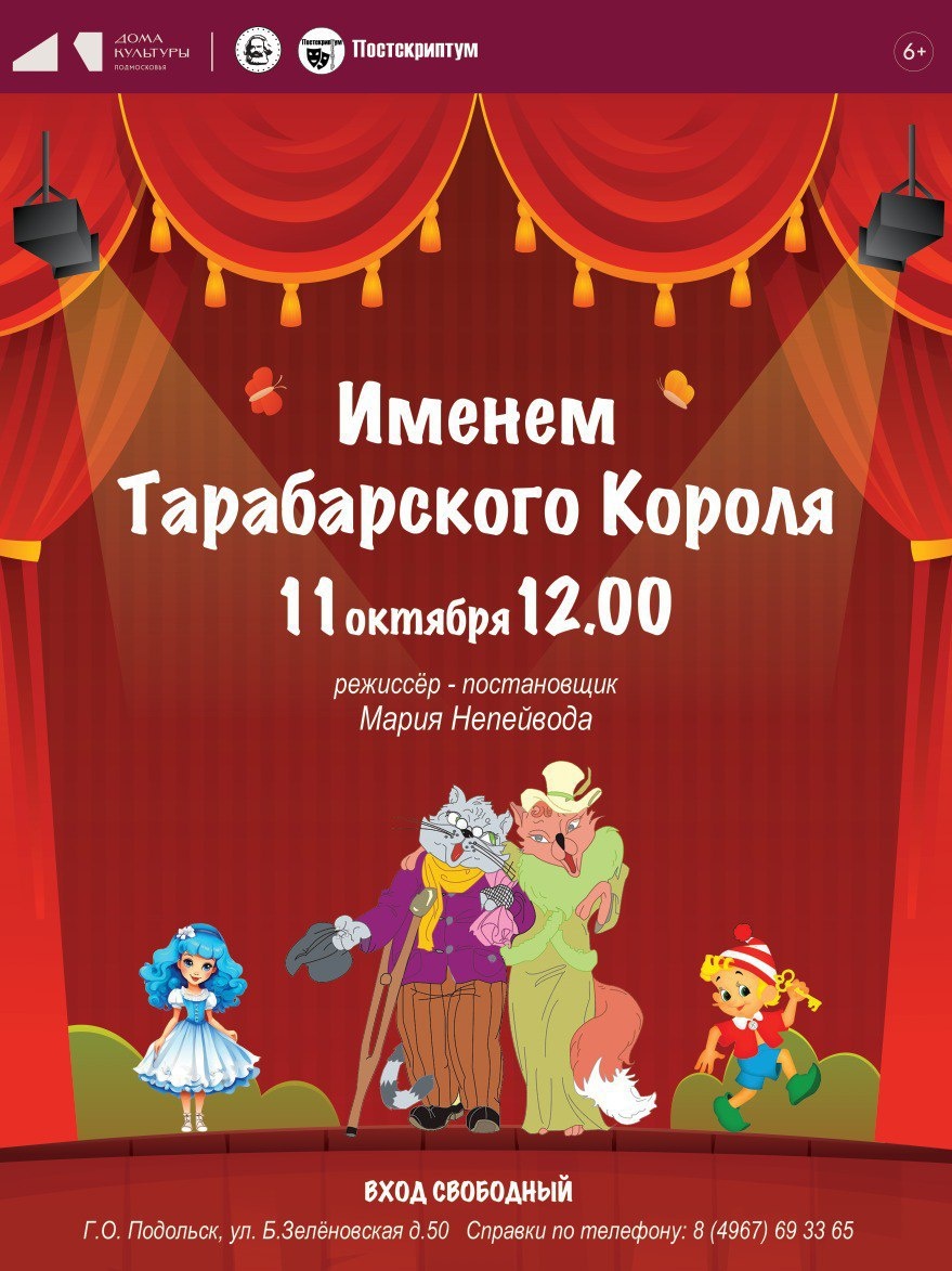 ✨ Спектакль «Именем Тарабарского короля»! Дорогие зрители! 🎭Театральный коллектив "Постскриптум" с радостью открывает новый сезон и приглашает вас на спектакль. 🎬Режиссёр - постановки - Мария Непейвода 🚫 Возраст: 6+ 📆 11.10.2025 🕒 12:00 🏢 ДК им. Карла Маркса 📍 г. Подольск, ул. Большая Зелёновская, 50 💰 Вход свободный❗️ #спектакльПодольск ⭐Поддержать канал голосом 💰 Вакансия - курьер в Подольске ✅ Мероприятия Подольск https://dzen.ru/id/66ed500f7b5671493eca3fd6 http://vk.com/podolsk_events http://dzen.ru/podolsk_events