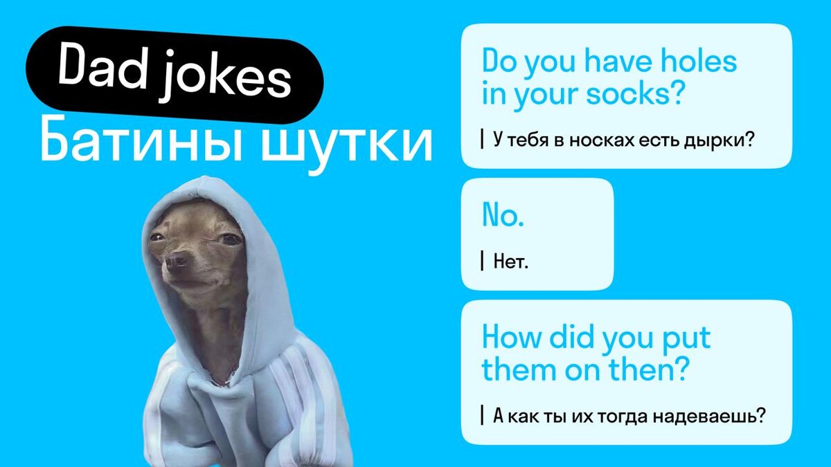 ? Собрали топ-5 dad jokes (батиных шуток) — дурацких и порой неприличных каламбуров 🤡 Если поймёте все — 80 уровень мемологии ваш! А за проверкой знаний приходите в наши бесплатные тесты 👉 https://go.skyeng.ru/10englishlevel10gt 👀 I went to buy some camouflage pants, but I couldn’t find any. Я пошёл купить камуфляжные штаны, но не смог их найти (потому что они замаскировались). 📆 I used to have a job at a calendar factory, but I got fired because I took a couple of days off. Я работал на календарной фабрике, но меня уволили, потому что я убрал несколько дней (took a couple of days off — взял несколько выходных). 🥤 Did you hear about the guy who got hit in the head with a can of soda? He was lucky it was a soft drink. Слышал о парне, которому в голову прилетела банка содовой? Повезло, что это был «мягкий» напиток (soft drink называют безалкогольные напитки). 🌶 What does a nosey pepper do? It gets jalapeño business. Что делает любопытный перец? Занимается делами халапеньо (to