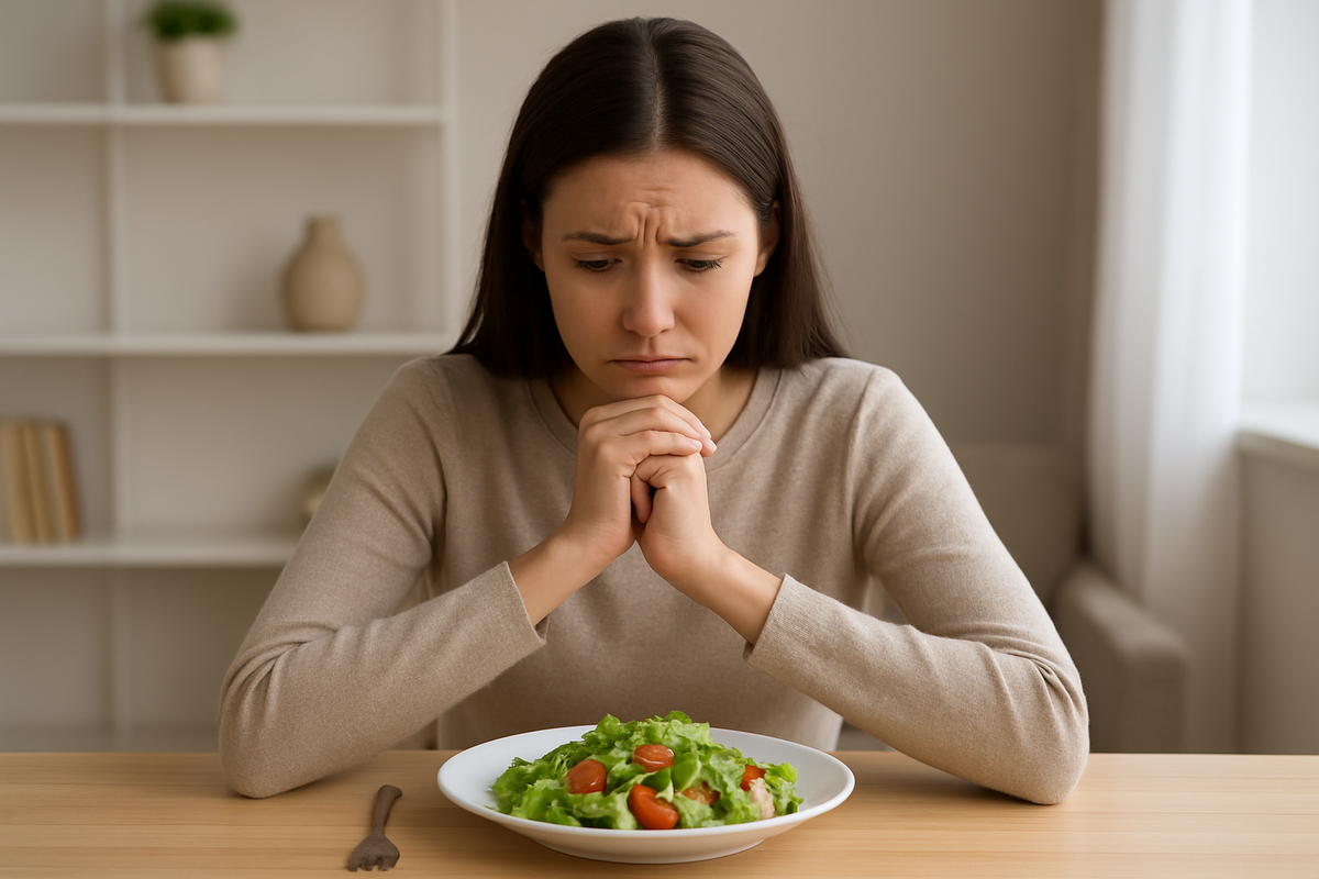 Кейс опубликован с разрешения клиента, все конфиденциальные данные изменены. Однажды ко мне на консультацию обратилась девушка по имени Олеся. Ей было двадцать лет, она работала СММ-специалистом и жила обычной жизнью, пока тревога не начала управлять всем её днём. Панические атаки, постоянное напряжение, ком в горле, страх тошноты — всё это лишило её аппетита и радости жизни. За месяц она потеряла пять килограммов, и каждый приём пищи превращался в испытание. Родители волновались, лекарства не помогали, и тогда семья решила попробовать психотерапию. Так мы и познакомились. На первой встрече Олеся рассказала, что боится кушать. Она заранее представляла, как станет плохо, и от этого тревога только усиливалась. Я объяснил, что тревога часто возникает не из-за самих симптомов, а из-за отношения к ним. Мы вместе нашли несколько установок, которые подливали масла в огонь: Мы начали с первой. Я предложил взглянуть на ситуацию иначе: «Мне бы хотелось чувствовать себя хорошо, и я стараюсь этому