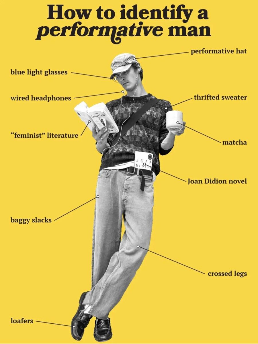 Начнем с мужчин Performative male - это вирусный мем и термин, относящийся к архетипу матча-мэна (matcha man), который проявляет феминизм, а также эмоциональную чувствительностью, читает All About Love, слушает инди-художниц, пьет латте матча и носит Labubu (почему моя Uniqlo для бедных попала под раздачу - ми донт кноу) и, !!!!как правило!!!! , делается это всё как средство поверхностного обращения к женщинам с намерением преследовать их романтически (клянусь это цитата из Википедии) Крч, как перфоманс, а не for real Чтобы нам нравится стараются Ну это мило на мой взгляд, но мой взгляд с точки зрения феминизма так себе