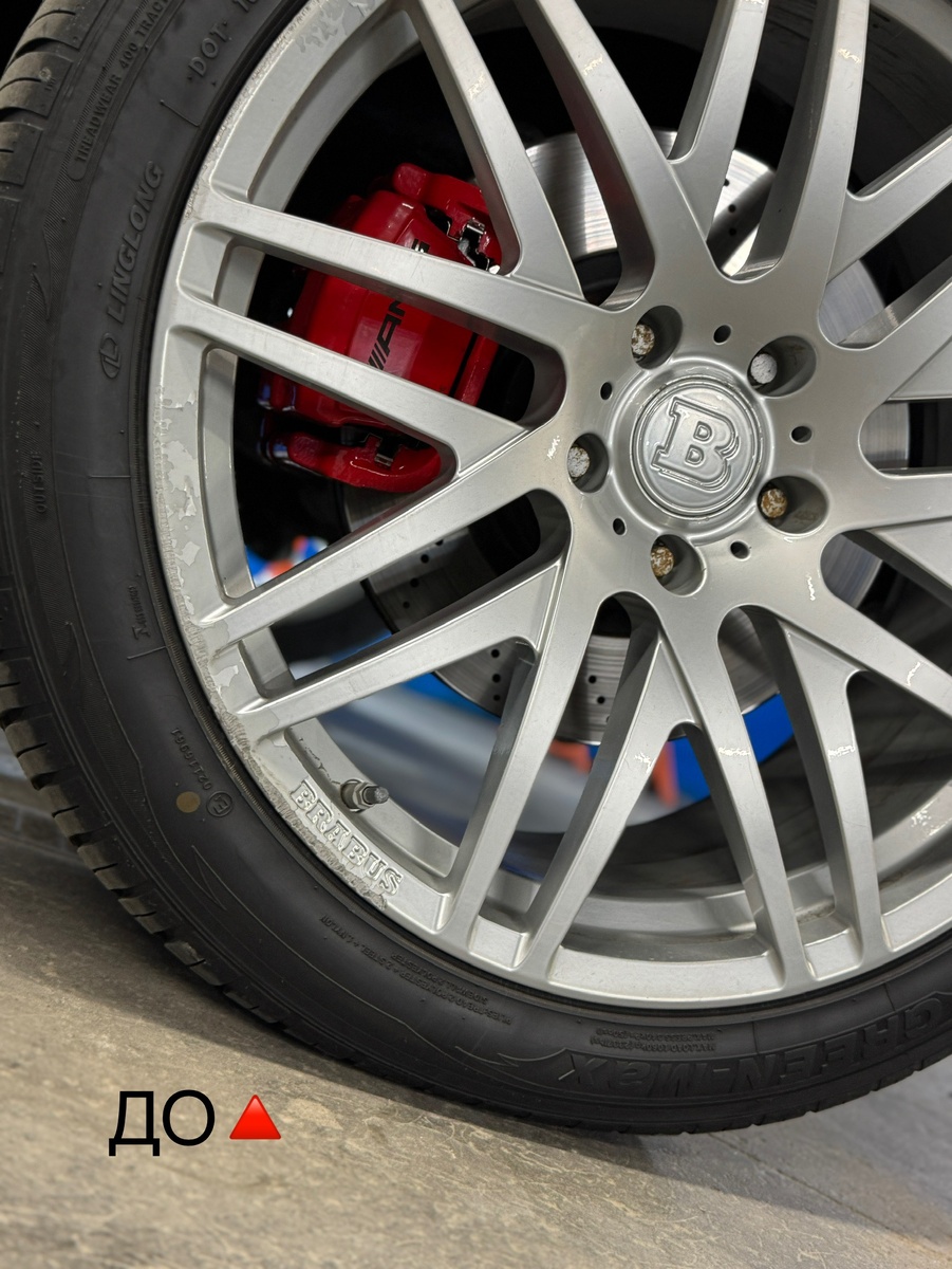 Дискам этого G63 явно не хватало ухода: были бордюрки, сколы и другие дефекты. Мы устранили все повреждения, покрасили диски в черный сатин, а кант — в цвет кузова. Кстати, мы можем не только покрасить диски по вашему желанию, но и изготовить новые.