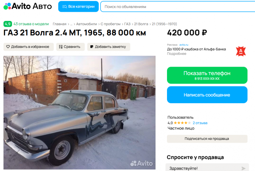 Ровно 69 лет назад, 10 октября 1956 года, из заводских ворот в Горьком выехали первые три автомобиля ГАЗ-21 «Волга». Эта модель вскоре стала настоящим символом советской эпохи и заняла своё место в культуре, в том числе в известных кинолентах. В честь дня рождения легендарной «Волги» «Авито Авто» подготовил подборку из «именинниц» в Омске. Подборку открывает двухцветная «Волга» 1967 года выпуска. Автомобиль оснащён двигателем объёмом 2,4 литра и мощностью 65 лошадиных сил. Пробег составляет всего 45 тысяч км. На капоте красуется легендарный «летящий олень». Продавец утверждает, что все комплектующие машины — оригинальные. Цена на Авито составляет 750 тысяч рублей. Следующая «именинница» — «Волга» 1969 года выпуска, выставленная за 420 тысяч рублей. Пробег машины — 88 тысяч км, и она была полностью отреставрирована. В этом экземпляре установлен двигатель объёмом 2,4 литра с мощностью 65 лошадиных сил, а также, конечно, рисунок «летящего оленя». Скриншот: «Авито» Завершает подборку ещё о
