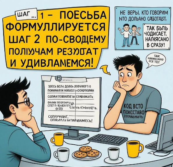 Мораль: ТЗ — это не просто текст, это искусство. Если написать «купи вкусняшку», а тебе принесут вяленую рыбу, не удивляйся. Программисты мыслят кодами, а не пончиками.